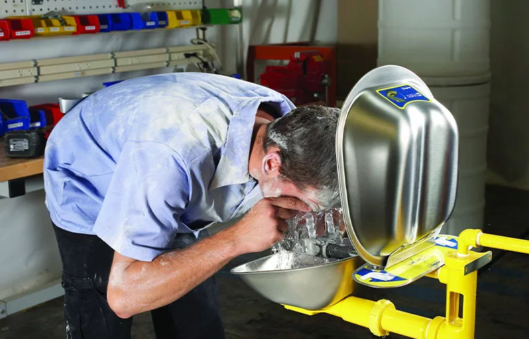 Chemical splashes often affect more than just the eyes. Fallout from vapors, mists and splashes can reach the forehead, cheeks and surrounding facial areas. That’s why eye/facewash units – not just basic eyewash bowls – are recommended in many chemical-handling environments.