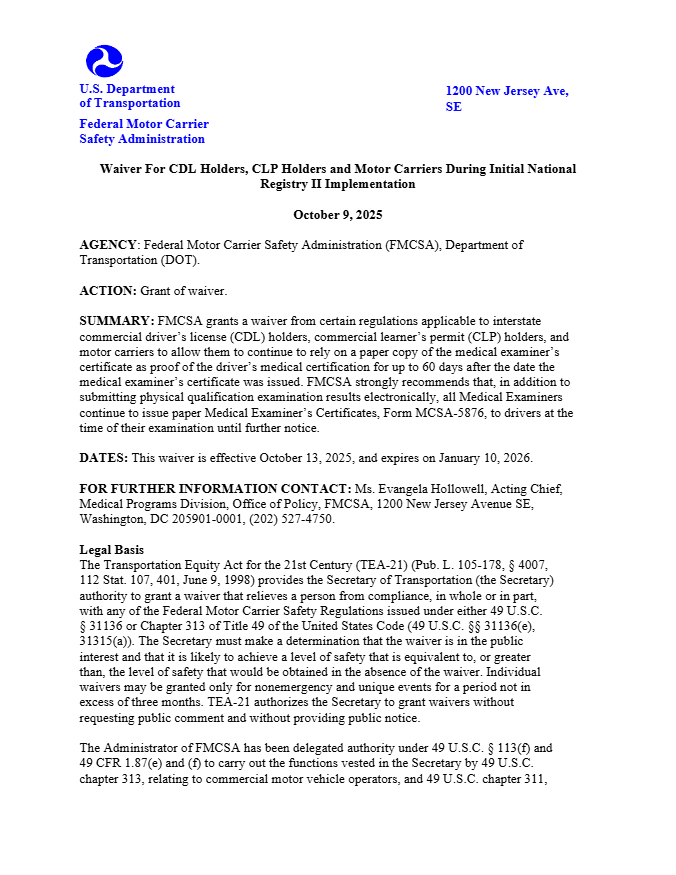 Under this waiver, interstate CDL and CLP holders, as well as motor carriers, may continue using a paper copy of the Medical Examiner’s Certificate (Form MCSA-5876) as proof of medical certification for up to 60 days after the date of issuance.This extension is intended to ease the transition as states continue onboarding to the NRII electronic system. The waiver is effective October 13, 2025, through January 10, 2026.